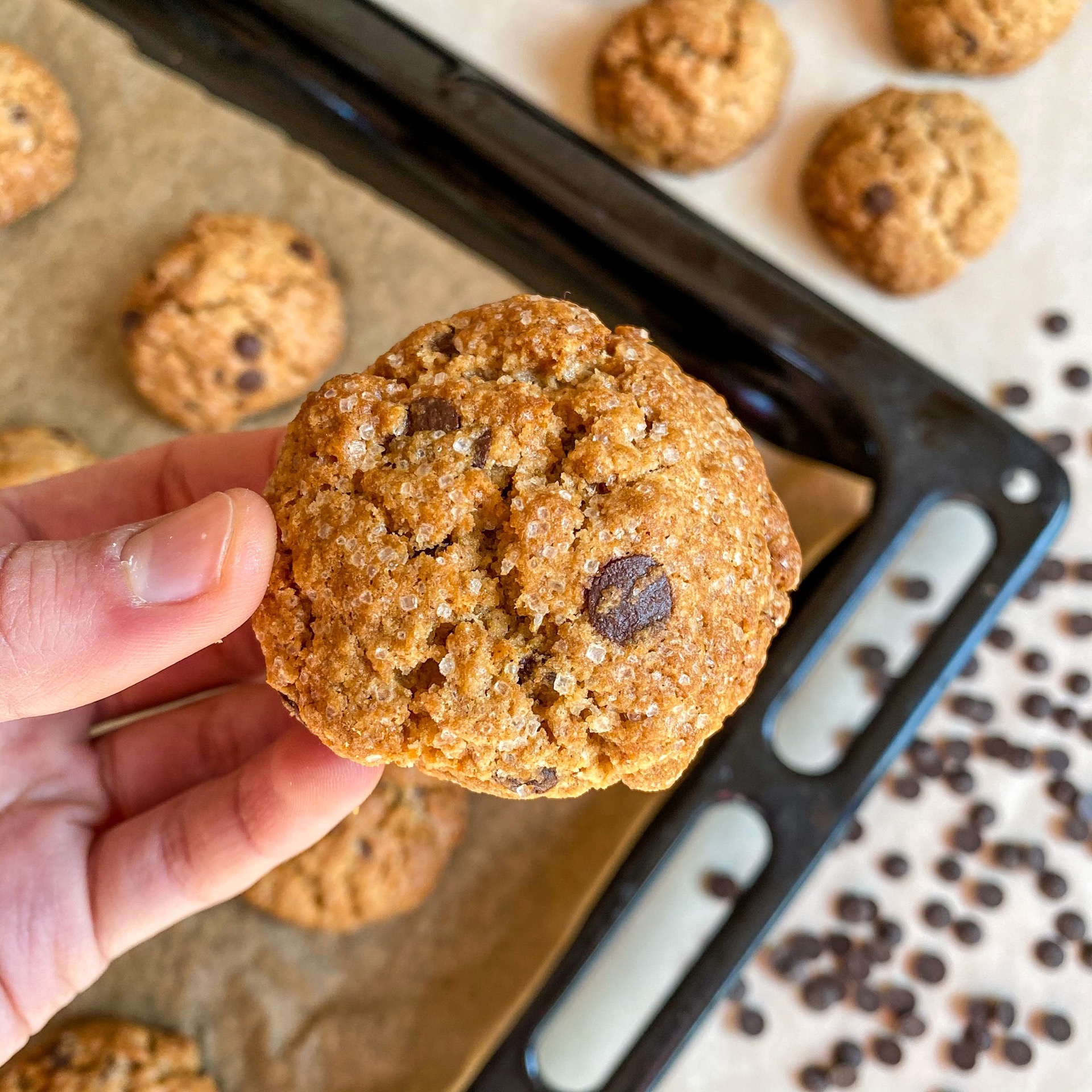 Smícháme všechny sypké ingredience kromě čokoládových peciček. Vejce vyšleháme s máslem a postupně přidávám i sypkou směs. Celé mixujeme. Když uvidíme, že jsou všechny suroviny promíchané, těsto přendáme do misky a přimícháme čokoládové pecičky. Následně na plech, vyložený pečícím papírem tvoříme kuličky. Pečeme v předehřáté troubě na 190° cca 20 minut.